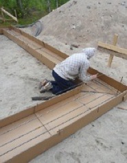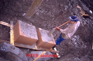 Tiiliverhotun puutalon valesokkeliin sopiva kapea muotti , syntyy leikkaamalla TIILI-PALIKASTA siivu pois. Betoninkulutus n 55 l/m2